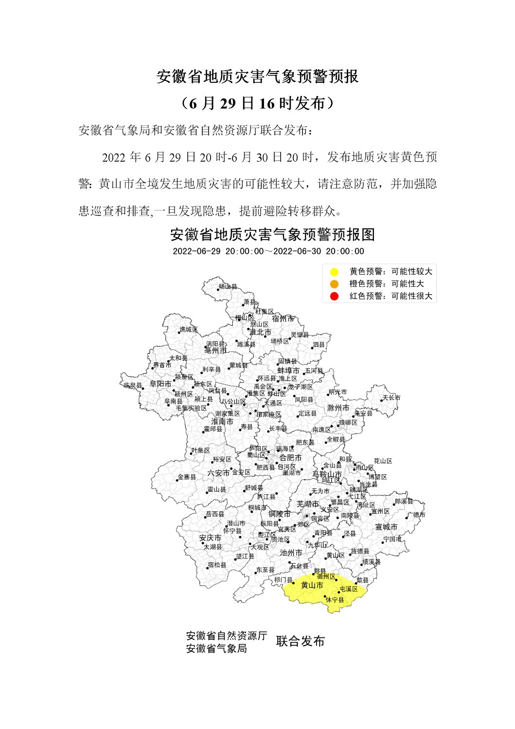 【摘要】:新安晚报 安徽网 大皖新闻讯 据@安徽气象 消息,安徽省气象局和安徽省自然资源厅联合发布地质灾害预警:2022年6月29日20时-6月30日20时,发布地质灾害黄色预警:黄山市全境发生地质新安晚报 安徽网 大皖新闻讯 据@安徽气象 消息,安徽省气象局和安徽省自然资源厅联合发布地质灾害预警:2022年6月29日20时-6月30日20时,发布地质灾害黄色预警:黄山市全境发生地质灾害的可能性较大,请注意防范,并加强隐患巡查和排查,一旦发现隐患,提前避险转移群众。