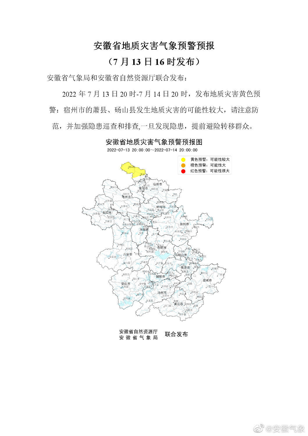 新安晚报 安徽网 大皖新闻讯 据@安徽气象 消息 7月13日16时,安徽省气象局和安徽省自然资源厅联合发布地质灾害气象预警预报。